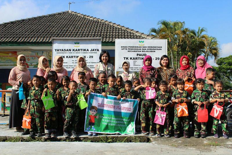 Sukoharjo – Anggota Persit bekerja sama dengan para guru TK Kartika Yonif Mekanis Raider 413/Bremoro Kostrad melatih murid-muridnya untuk menjaga lingkungan sekolah dengan melakukan diet kantong plastik, Rabu (06/02/2019).