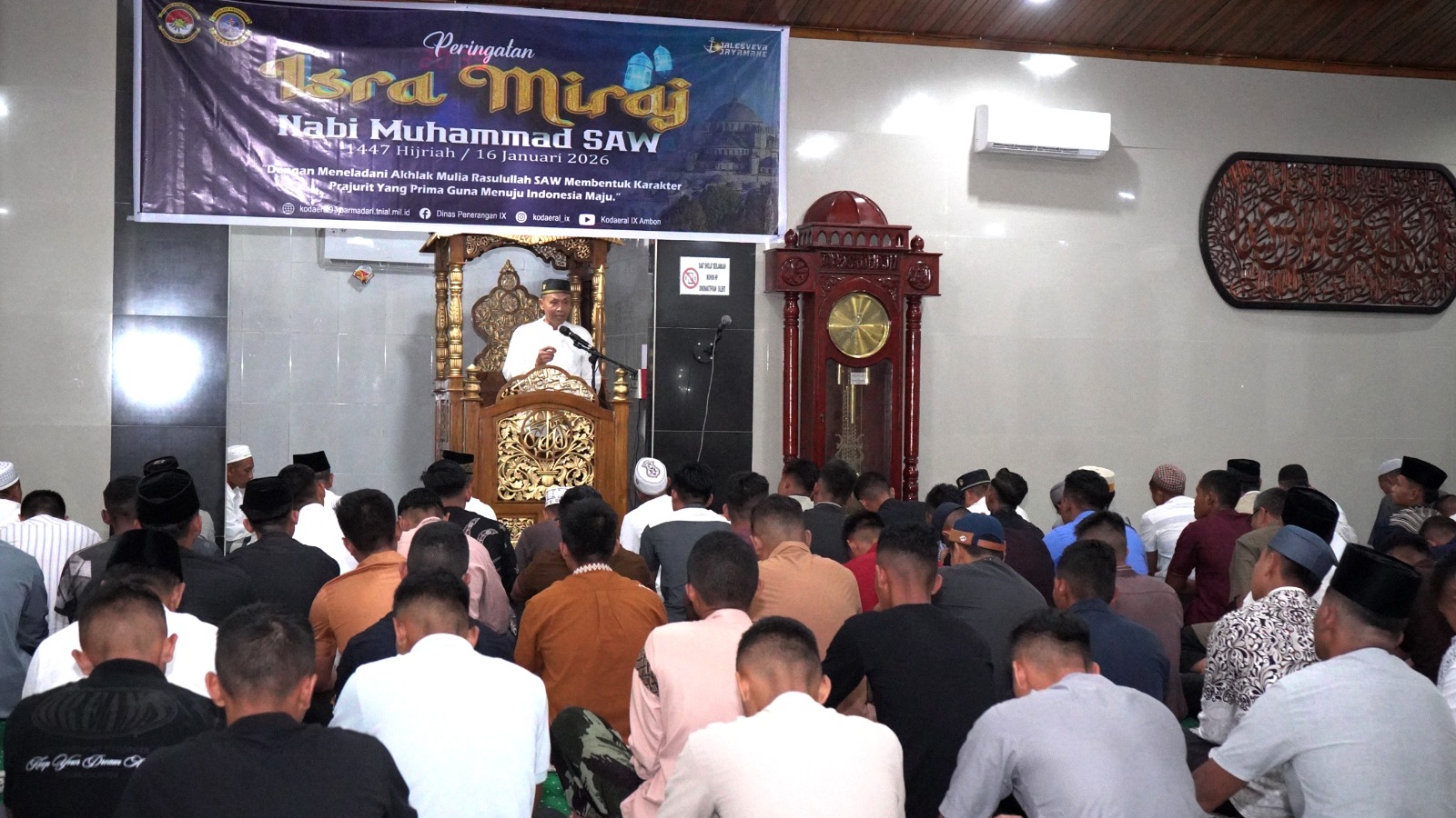 Ambon, Kodaeral IX. (17/1/2026) – Guna mempertebal keimanan dan ketaqwaan prajurit kepada Allah Subhanahu wa ta’alla, Komando Daerah Angkatan Laut lX (Kodaeral lX) menggelar peringatan Isra Mi’raj Nabi Muhammad SAW yang dihelat di Masjid Nurul Iman, Mako Kodaeral IX, Kota Ambon, Maluku pada Jumat malam (16/1/2026).