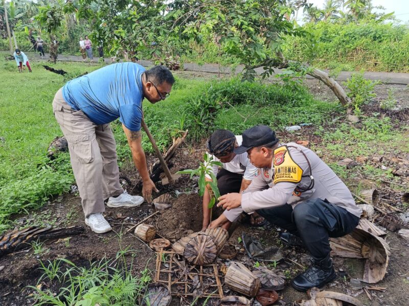 Jembrana – Upaya memelihara keamanan dan ketertiban masyarakat (Kamtibmas) yang kondusif sekaligus mendukung kelestarian lingkungan, Bhabinkamtibmas Desa Budeng Polsek Kota Jembrana Aiptu I Wayan Suadi bersama pemerintah desa dan adat menggelar kegiatan gotong royong penanaman pohon kelapa dan alpokat di Banjar Delod Pangkung, Desa Budeng, Kecamatan Jembrana, Sabtu (25/10/2025).