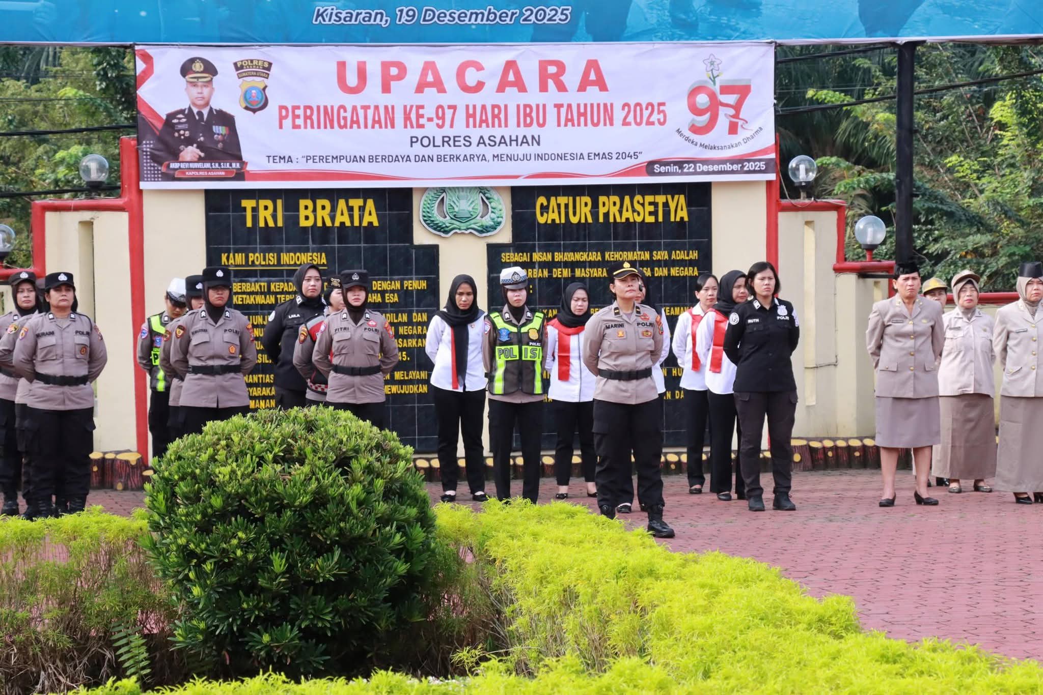 Asahan – Dalam rangka memperingati Hari Ibu ke-97 Tahun 2025, Polres Asahan melaksanakan upacara peringatan yang berlangsung khidmat di Lapangan Apel Mako Polres Asahan, Jalan Jenderal Ahmad Yani, Kisaran, Kabupaten Asahan, pada Selasa, 22 Desember 2025, sekira pukul 08.00 WIB.