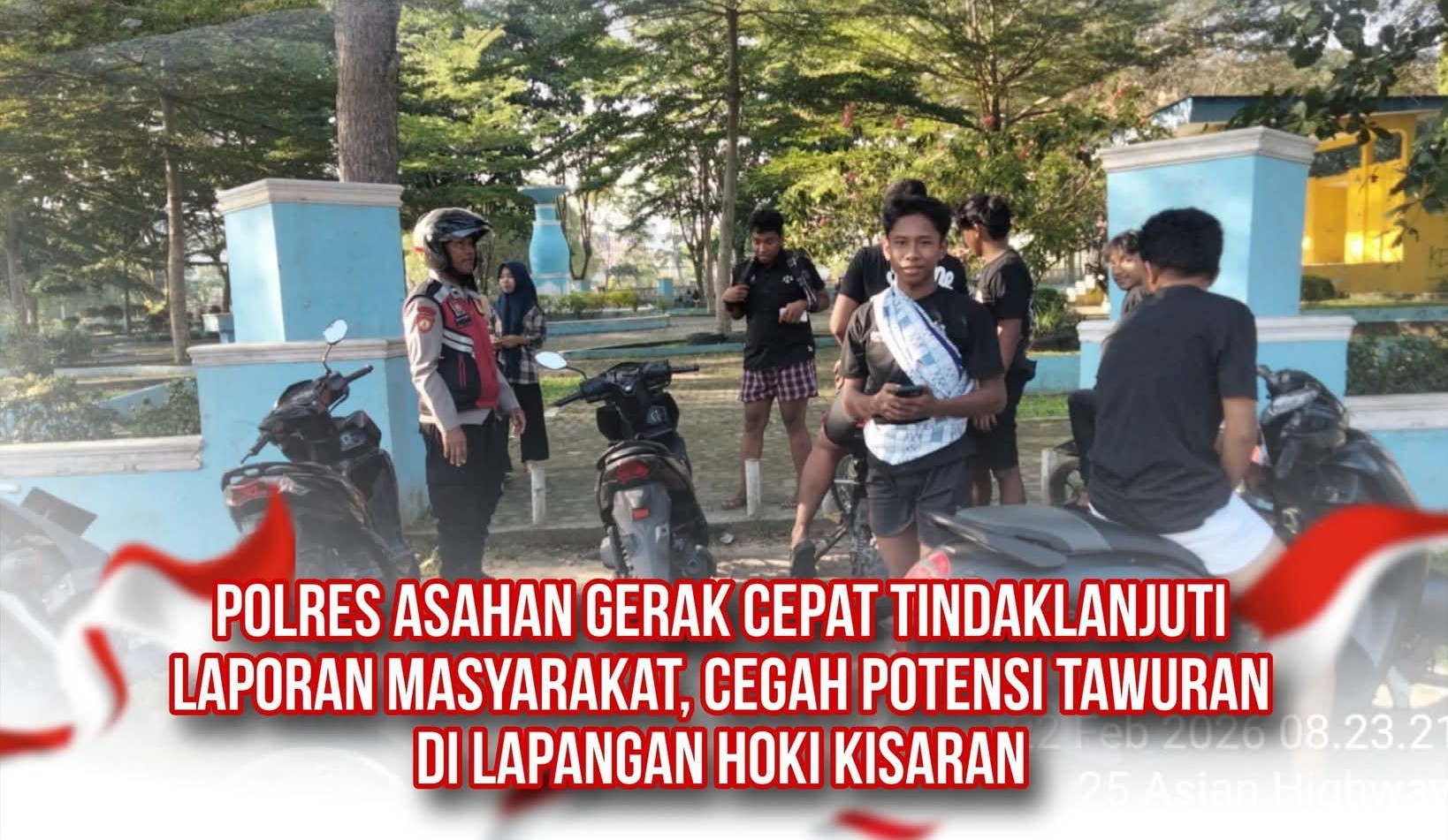 Asahan – Polres Asahan melalui personel piket dan Patroli Presisi bergerak cepat menindaklanjuti laporan masyarakat yang masuk melalui layanan Call Center 110 terkait adanya sekelompok pemuda yang berkumpul dan diduga akan melakukan tawuran di Lapangan Hoki, Kelurahan Mekar Baru, Kecamatan Kisaran Barat, Kabupaten Asahan, Minggu (22/02/2026).