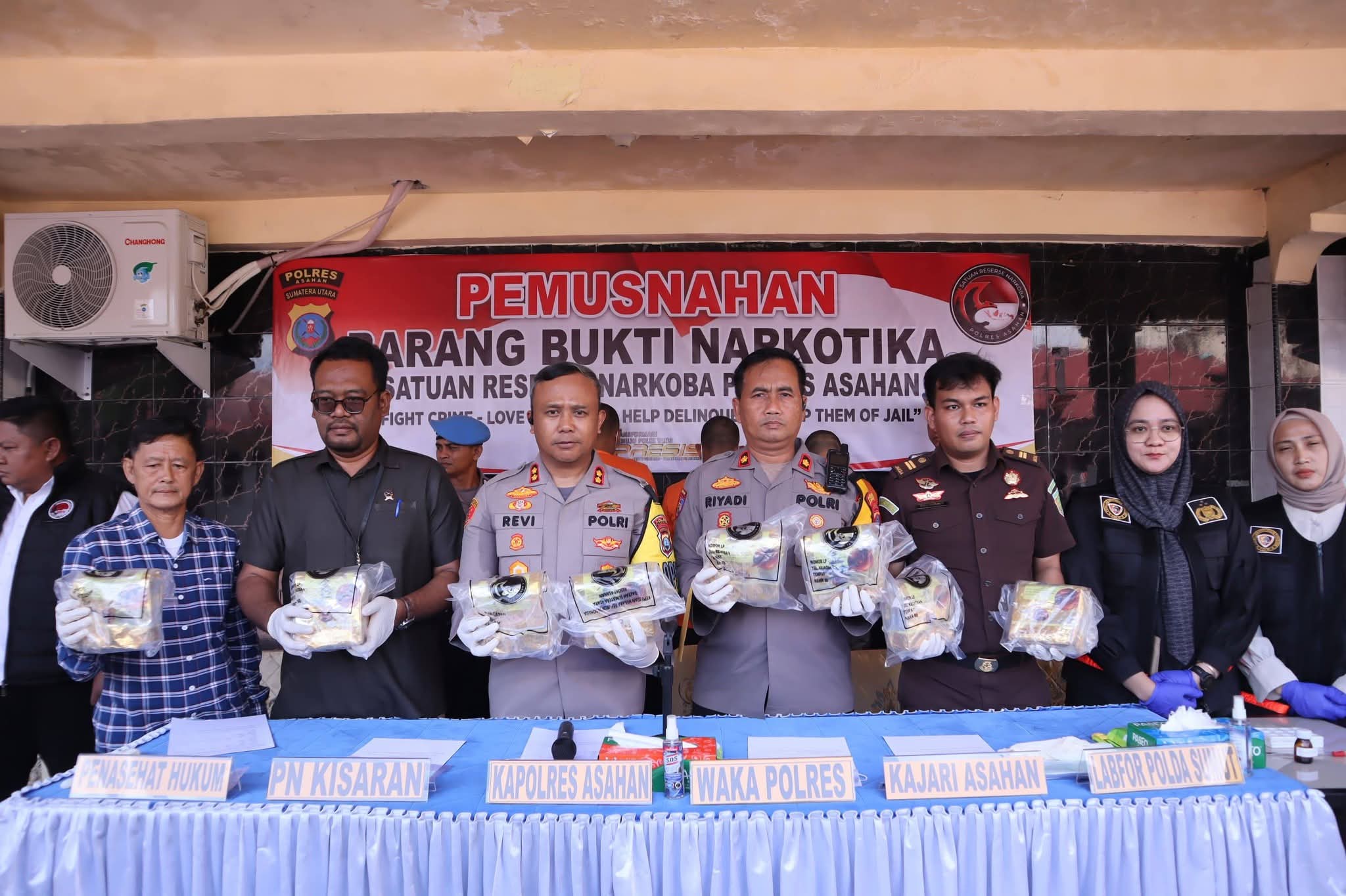 Pemusnahan tersebut dipimpin langsung oleh Kapolres Asahan AKBP Revi Nurvelani, S.H., S.I.K., M.H., serta dihadiri Wakapolres Asahan, Kasat Narkoba Polres Asahan, perwakilan Pengadilan Negeri Kisaran, Kejaksaan Negeri Kisaran, Laboratorium Forensik Polda Sumut, Penasehat Hukum, para tersangka, dan awak media.