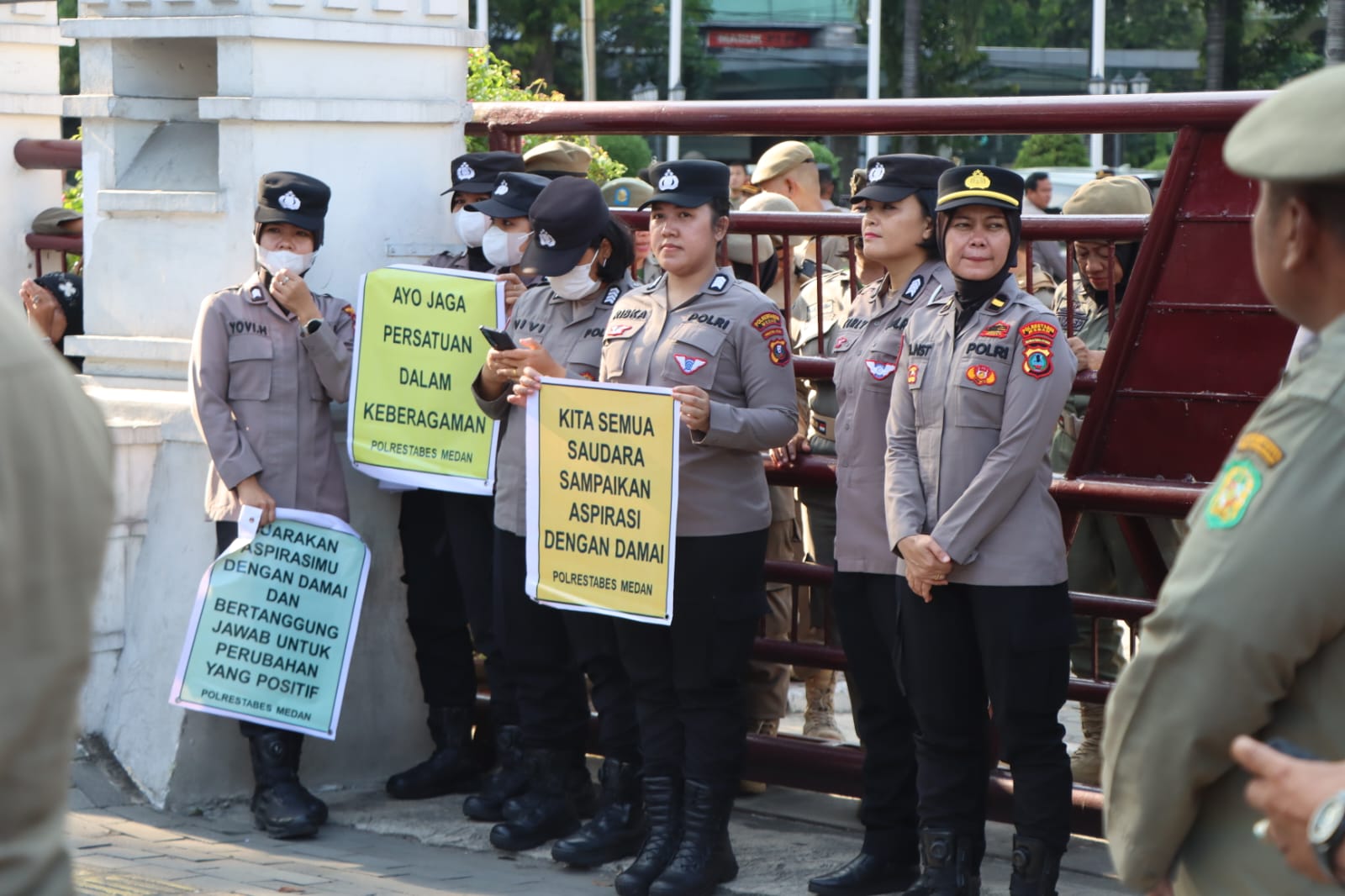 Suasana aksi terasa sejuk dengan kehadiran barisan Polwan dari Polrestabes Medan yang berada di garda terdepan pengamanan. Berbeda dari pola pengamanan pada umumnya, para Polwan tidak membawa tameng maupun perlengkapan taktis. Mereka justru membentangkan poster berisi pesan-pesan humanis seperti “Sampaikan Aspirasimu, Jaga Martabat Bangsamu”, “Aksi Tertib adalah Cerminan Masyarakat Dewasa”, dan “Jangan Biarkan Provokator Menyusupi Aksi Damai”.