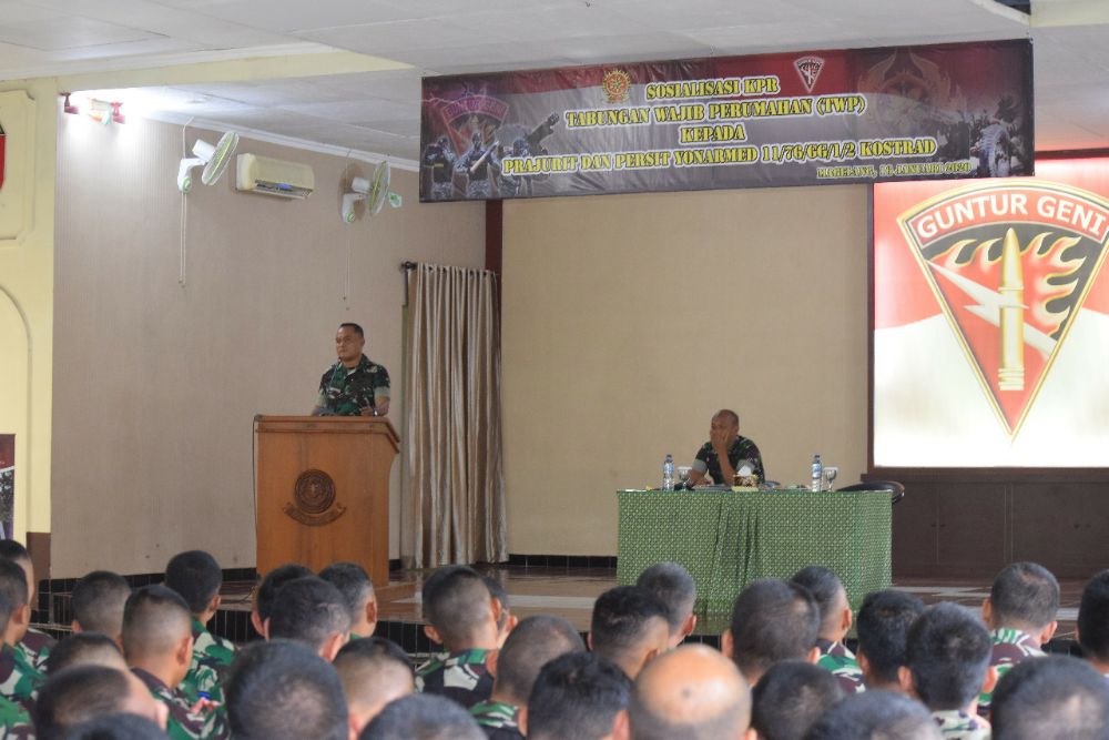 Magelang – Anggota Yonarmed 11 Kostrad menerima sosialisasi Tabungan Wajib Perumahan (TWP) beserta pengembang perumahan yang bertempat di Gedung Guntur Geni (G3) Yonarmed 11 Kostrad, Jl. Khoesen Hirohusodo Kelurahan Gelangan, Kec. Magelang Tengah, Kota Magelang. Kamis (16/1).