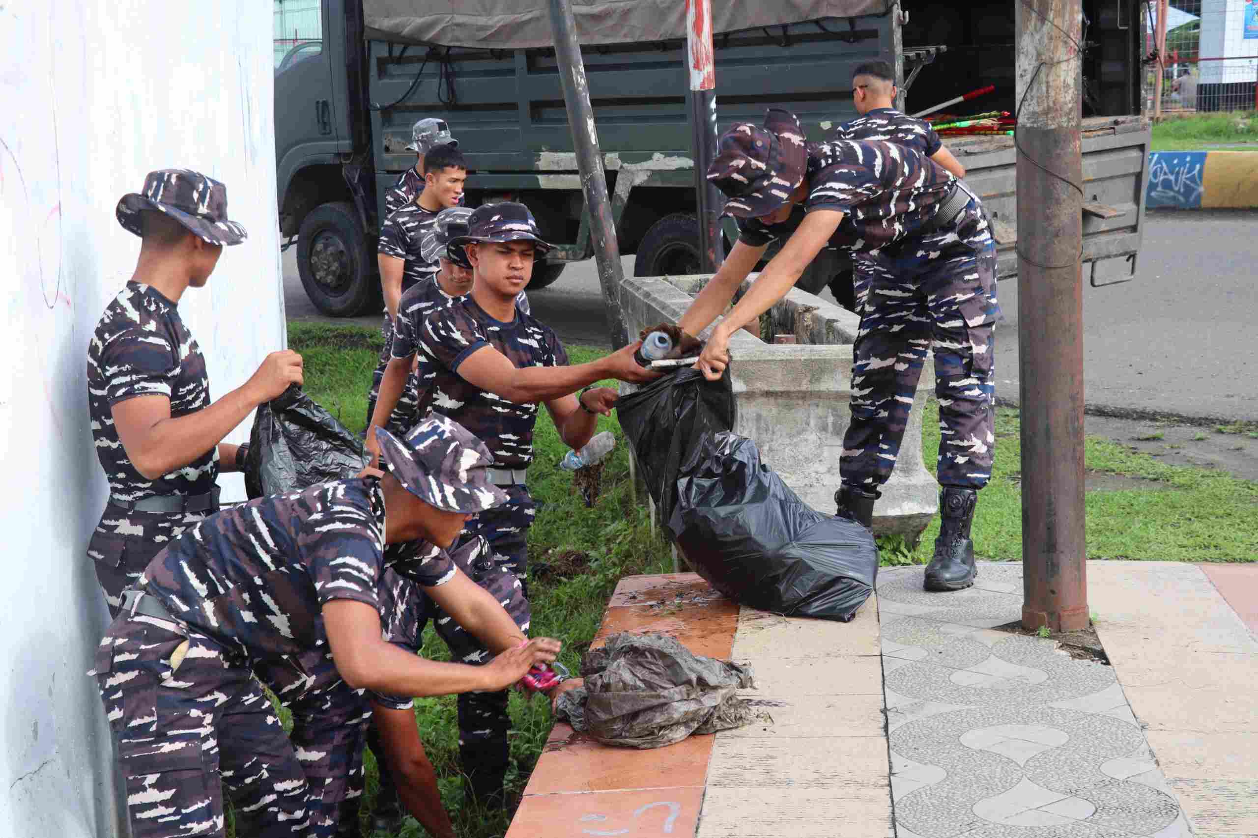 Tampak terlihat Prajurit Kodaeral XIV dengan penuh semangat, membersihkan dan mengangkat sampah yang berada di Jalan Ahmad Yani mulai pertigaan lampu merah SUPM sampai perempatan Kuda Laut, sampah yang menyumbat saluran air dan rumput sepanjang jalan langsung dibersihkan dan diangkat untuk dikumpulkan dan dibuang ke TPA.