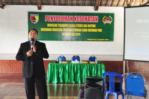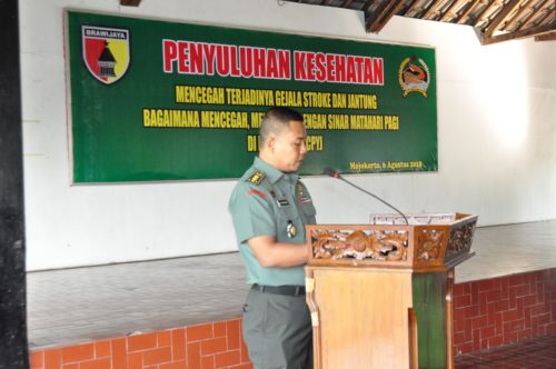 Mojokerto – Seluruh prajurit Korem 082/CPYJ beramai-ramai mendatangi Pendopo Griya Paramita Cikaran. Kedatangan itu, bertujuan untuk menerima penyuluhan tentang gejala stroke dan penyakit jantung yang di berikan oleh salah satu perusahaan yang bergerak di bidang produk kesehatan.