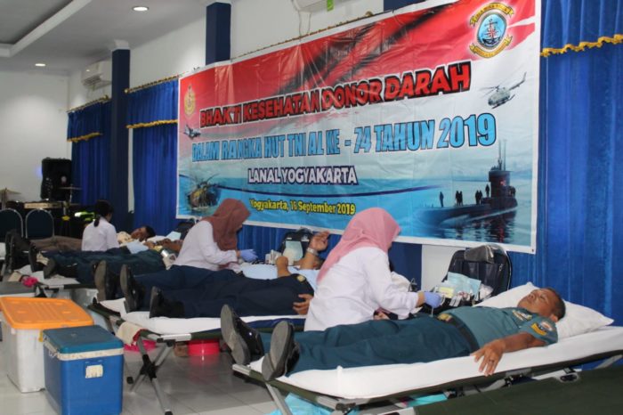 Yogyakarta – Meriahkan Hari Ulang Tahun (HUT) Ke-74 TNI Angkatan Laut tahun 2019, prajurit dan PNS Pangkalan TNI Angkatan Laut (Lanal) Jogyakarta, Lantamal V, Koarmada ll menyumbangkan darahnya falam Bhakti Sosial Kesehatan yang yang digelar Balai Kesehatan (BK) Lanal Yogyakarta, Selasa (17/9).