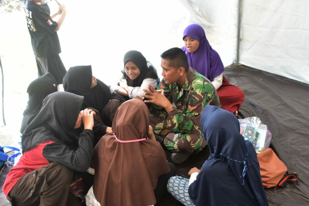 Palu – Prajurit TN dari Batalyon Infanteri Para Raider 432/Waspada Setia Jaya (Yonif Para Raider 432/WSJ) Divisi 3/Kostrad yang tergabung dalam Komando Tugas Gabungan Terpadu (Kogasgabpad) Penanggulangan Bencana Gempa Bumi dan Tsunami di Provinsi Sulawesi Tengah (Sulteng), ikut membantu mengajar murid-murid Sekolah Dasar.