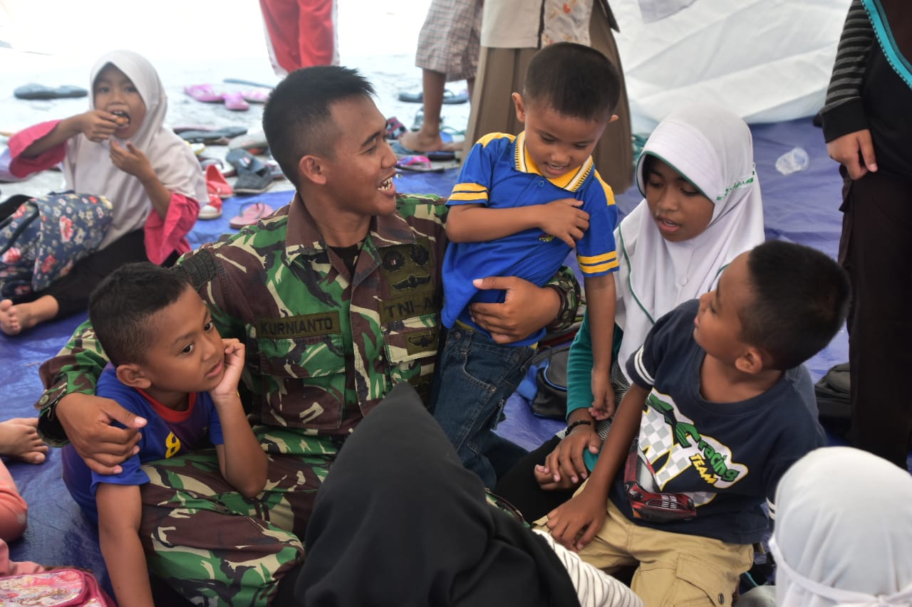 Palu – Prajurit TN dari Batalyon Infanteri Para Raider 432/Waspada Setia Jaya (Yonif Para Raider 432/WSJ) Divisi 3/Kostrad yang tergabung dalam Komando Tugas Gabungan Terpadu (Kogasgabpad) Penanggulangan Bencana Gempa Bumi dan Tsunami di Provinsi Sulawesi Tengah (Sulteng), ikut membantu mengajar murid-murid Sekolah Dasar.