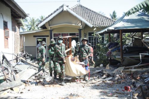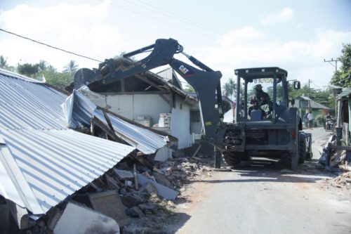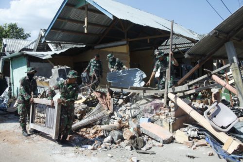 Lombok – Prajurit TNI Batalyon Zipur 10 Kostrad terus menyisir dan membersihkan reruntuhan rumah warga akibat gempa bumi beberapa waktu lalu di Kecamatan Kayangan, Lombok Utara, Kamis (16/8/2018).