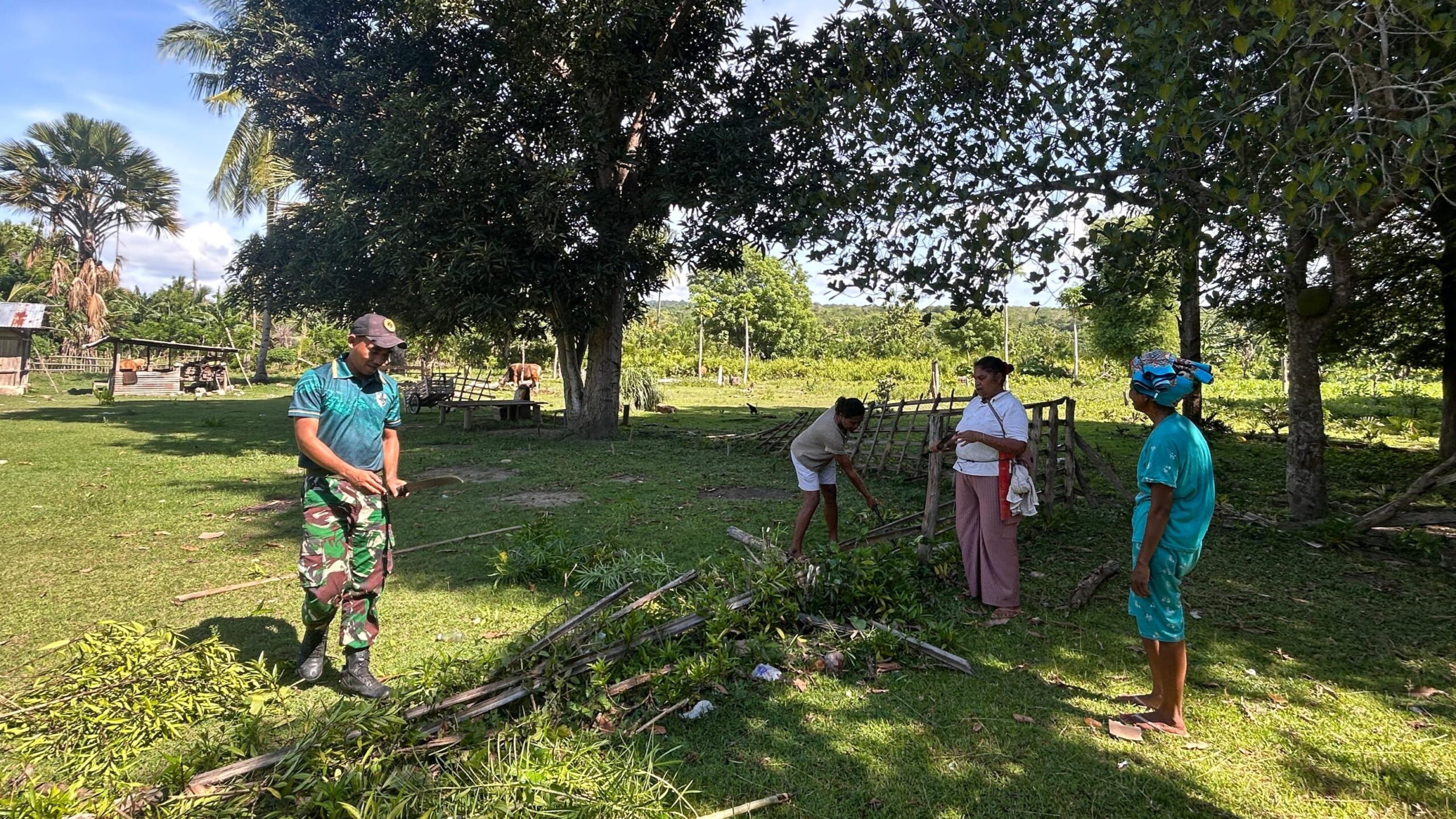 Dengan penuh semangat, para prajurit bergotong royong membersihkan bagian dalam kapela, merapikan halaman, serta menata lingkungan sekitar agar terlihat lebih bersih dan nyaman. Suasana hangat dan akrab tercipta saat prajurit dan masyarakat saling bahu-membahu, mencerminkan kemanunggalan yang tumbuh kuat di tengah kehidupan perbatasan.