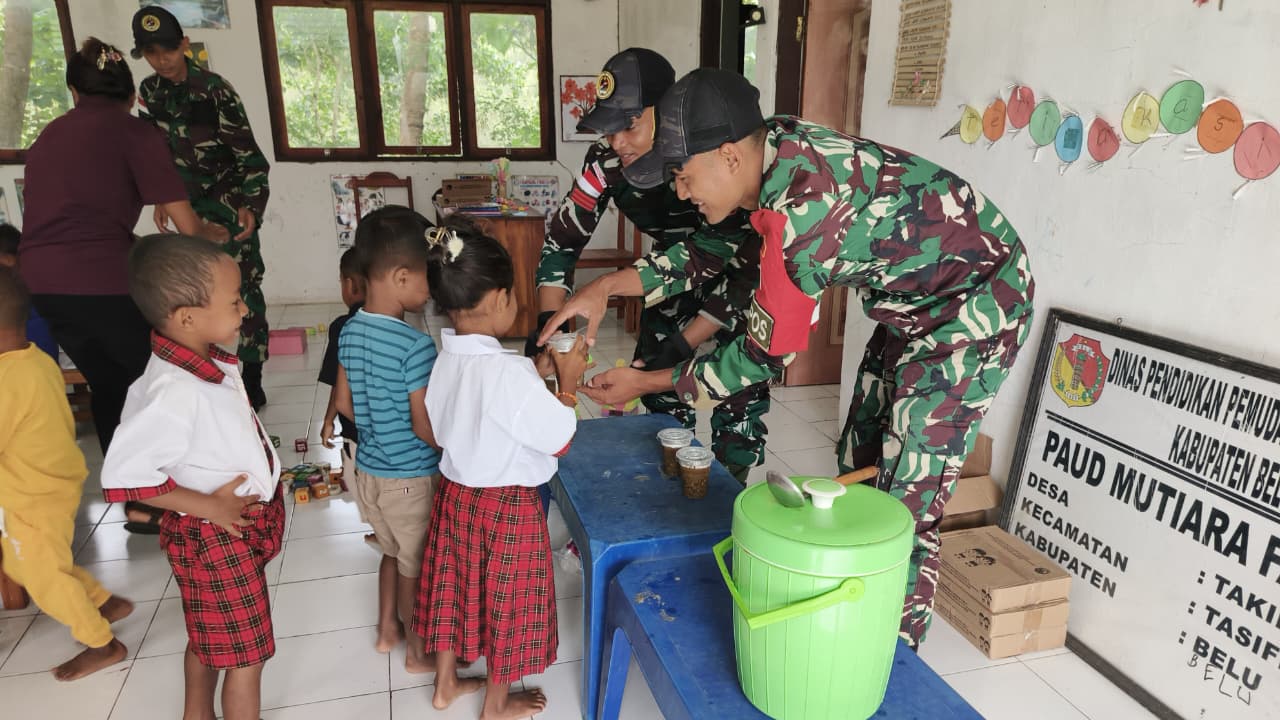 Belu – Satgas Pamtas RI–RDTL Sektor Timur Yonarmed 12 Kostrad melalui Pos Fatubesi Atas melaksanakan kegiatan pembagian bubur kacang hijau kepada anak-anak PAUD di Desa Takirin, Kecamatan Tasifeto Timur, Kabupaten Belu. Kegiatan ini merupakan bentuk kepedulian prajurit terhadap kesehatan dan pemenuhan gizi anak-anak di wilayah perbatasan, Rabu (11/02/2026).