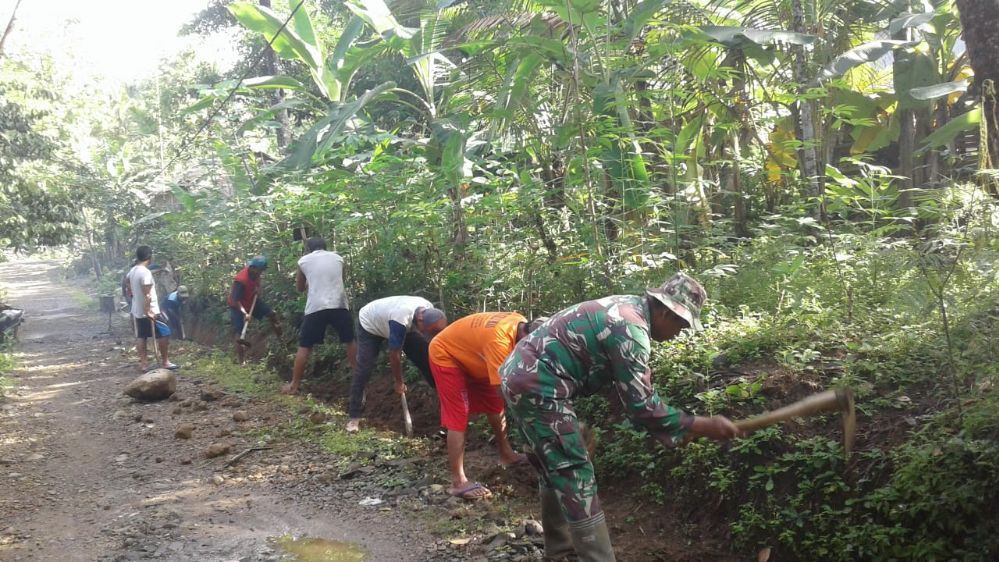 Cilacap – Babinsa Kedung Benda Koramil 05/Nusawungu Serda Miswanto bersama warga melaksanakan kegiatan gotong royong berupa pembersihan saluran air di tepi jalan yang berada RT 03/01 Dusun Kedung Benda Desa Kedung Benda Kecamatan Nusawungu, Rabu (6/02).