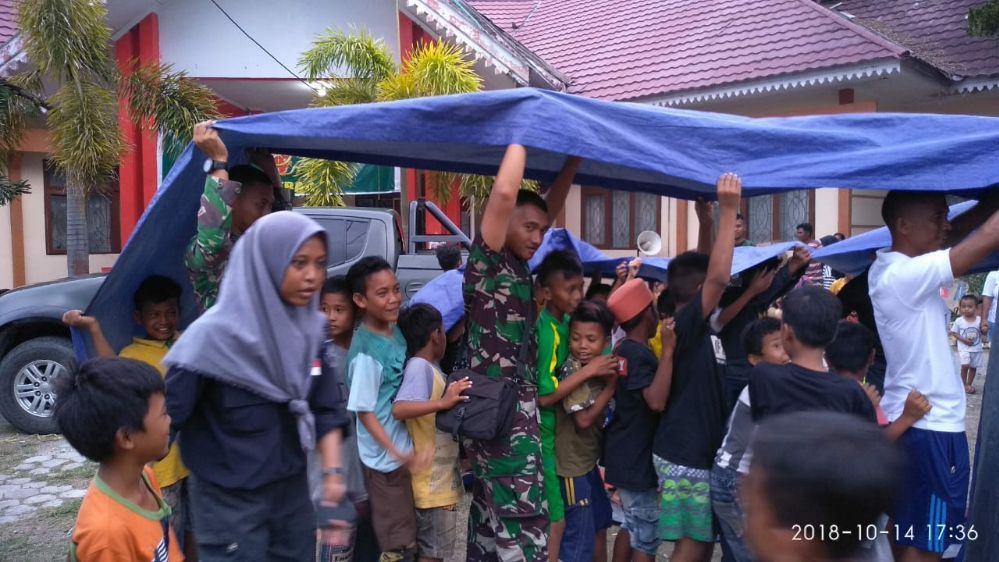 Donggala – Satgas Gulbencal gempa dan tsunami Palu dan Donggala Yonarmed 6 Divif 3 Kostrad dipimpim Mayor Arm Rohmadi, S.Sos. MTr.(Han) memberikan trauma healing kepada para pengungsi terutama anak-anak di Posko pengungsian Yonarmed 6 Kostrad, Donggala, Minggu (14/10).