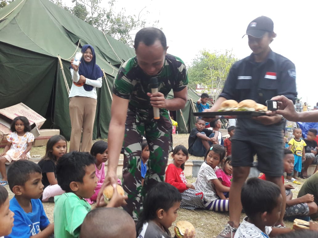 Donggala – Satgas Gulbencal gempa dan tsunami Palu dan Donggala Yonarmed 6 Divif 3 Kostrad dipimpim Mayor Arm Rohmadi, S.Sos. MTr.(Han) memberikan trauma healing kepada para pengungsi terutama anak-anak di Posko pengungsian Yonarmed 6 Kostrad, Donggala, Minggu (14/10).