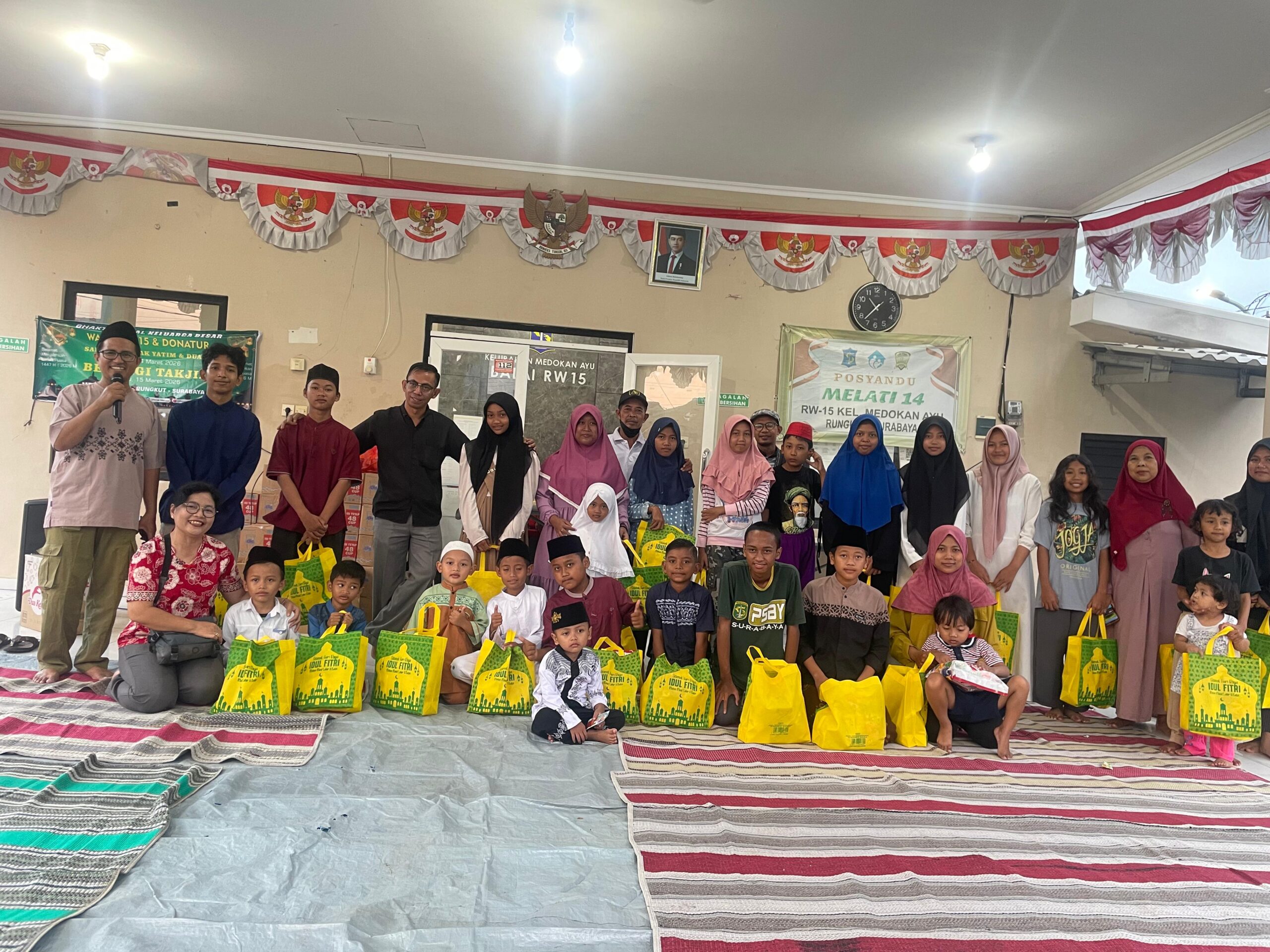 Gotong Royong yang menjadi adat warga setempat tiap bulan Ramadhan menunjukan rasa persaudaraan dan silahturahmi yang erat antar sesama menuju keimanan dalam beragama di bulan Puasa tahun 2026 ini. Sabtu 14 Maret 2026 Panitia Pelaksana Kegiatan yang terdiri dari Ketua RW dan Jajaran, Ketua RT, KSH (Kader Surabaya Hebat) RW15, Karang Taruna bersatu dalam kegiatan Santunan anak yatim piatu bertempat di Balai RW15 Jl. Griya Medayu Utara I Surabaya.