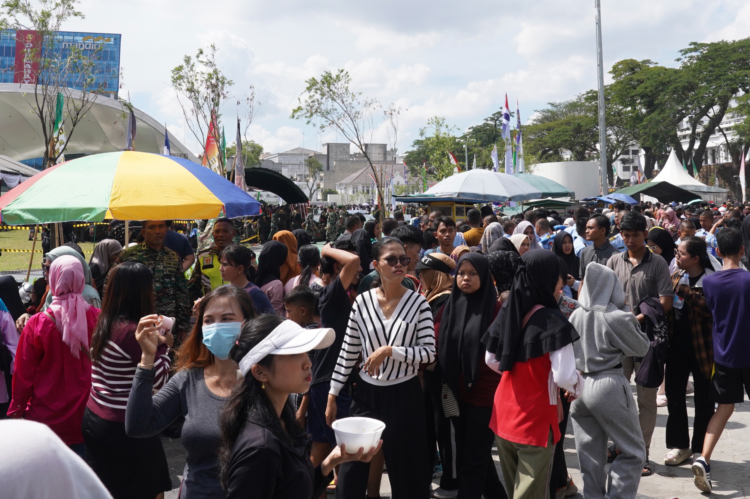 Stan-stan UMKM yang berjajar di sisi timur dan selatan lapangan tampak dipadati warga sejak pagi. Beragam kuliner khas daerah seperti lontong medan, bakso, sate, dan mie gomak menjadi buruan pengunjung yang datang bersama keluarga untuk menikmati suasana HUT TNI.