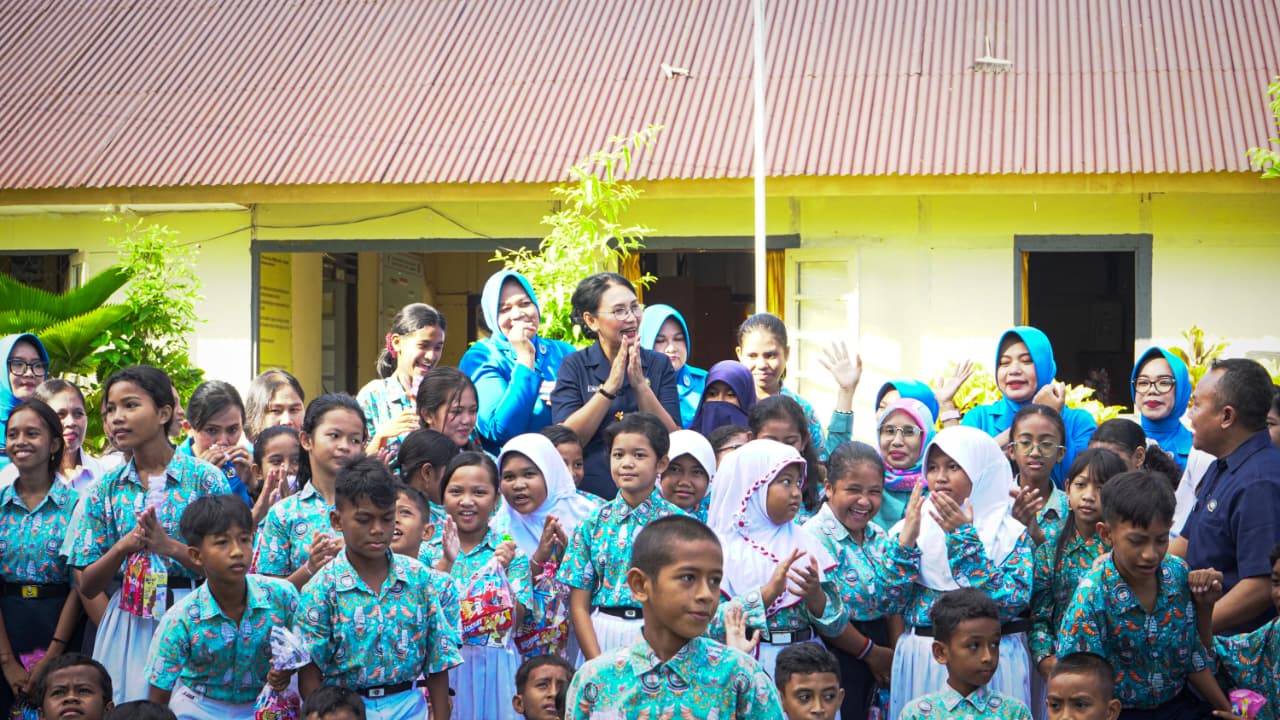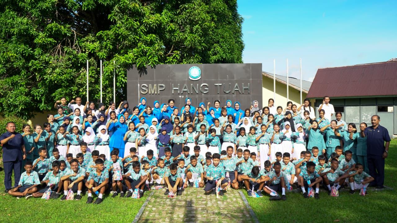 Ambon, Kodaeral IX (14/1/2026) – Ketua Daerah Kodaeral IX Gabungan Jalasenastri Koarmada RI, Ny. Inca Hanarko Djodi Pamungkas memberi kejutan bingkisan bagi siswa dan guru disela acara peringati Hari Ulang Tahun ke-79 Yayasan Hang Tuah Tahun 2026 yang digelar di Lapangan Upacara SMP Hang Tuah Mako Kodaeral IX pada Rabu (14/1/2026).