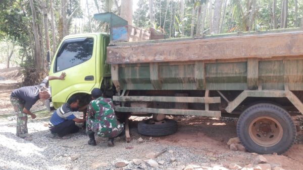 Beratnya medan dan panasnya cuaca dilokasi Pra TMMD itu tidak menyurutkan para pengemudi truk-truk pengangkut material untuk tetap melakukan aktifitas pengangkutan material sampai ketempat-tempat lokasi sasaran yang telah ditunjukkan oleh anggota satgas yang sudah ditunjuk utk mengawasi dan mengarahkan dimana saja droping material-material tersebut. (Hermansyah Pen – 13|red)