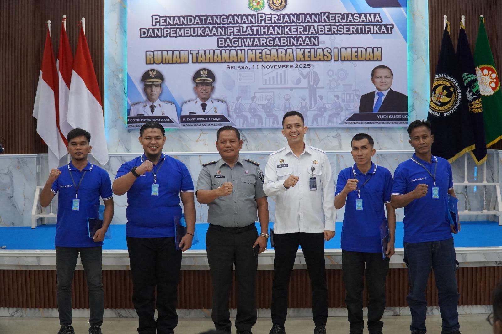 “Saat ini jumlah warga binaan di Rutan Kelas I Medan mencapai 3.290 orang, dan sekitar 2.340 di antaranya merupakan warga Kota Medan. Sebelumnya, kami telah melaksanakan berbagai pelatihan seperti pembuatan sandal, tas, mebel, paving block, pengelasan, hingga budidaya ikan dan sayuran. Namun pelatihan tersebut belum bersertifikat resmi, sehingga keterampilan yang dimiliki belum dapat dibuktikan secara formal,” jelas Andi Surya.