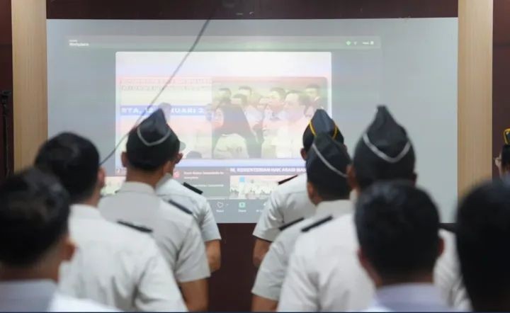Pangkalan Brandan — Rumah Tahanan Negara Kelas IIB Pangkalan Brandan mengikuti apel bersama secara virtual di lingkungan Kementerian Koordinator Bidang Hukum, Hak Asasi Manusia, Imigrasi, dan Pemasyarakatan, Senin (12/01). Kegiatan tersebut diikuti Karutan Pangkalan Brandan Akmalun Ikhsan beserta seluruh jajaran yang terpusat di ruang serbaguna.