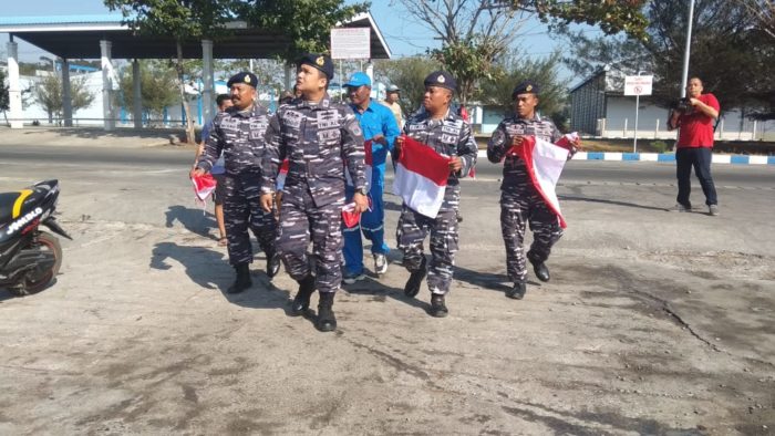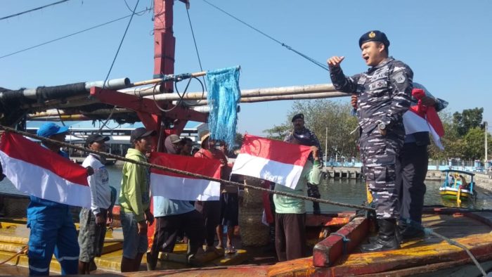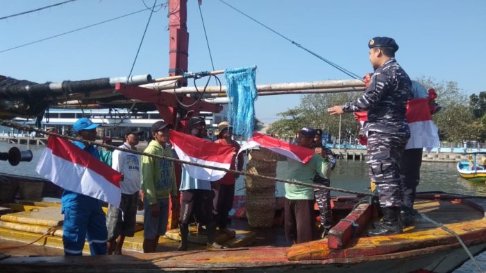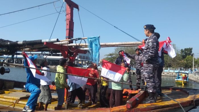 Probolinggo – Menjelang peringatan HUT ke-74 2019, Komandan Pos Kamla TNI – AL Mayangan Lettu Laut ( E ) Yogo Darma, S.T.Han bersama jajarannya mengajak nelayan Probolinggo memasang bendera merah putih di perahu atau kapal laut, Rabu (14/8).