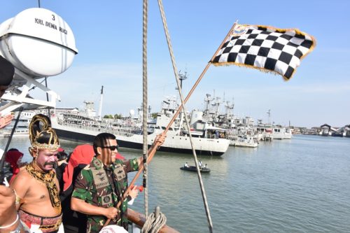 PB | Surabaya – Panglima Komando Armada RI Kawasan Timur (Pangarmatim) Laksamana Muda (Laksda) TNI Darwanto.S.H.,M.A.P., didampingi Ketua Daerah Jalasenastri Armatim Ny. Ina Darwanto yang berada di atas KRI Dewaruci melepas perlombaan dayung perahu naga yang memasuki final dalam memperebutkan juara Pertama, berlangsung di Kolam Basin Koarmatim, Ujung Surabaya. Rabu, (24/8/2016).Perlombaan dalam rangka memperingati Hari Ulang Tahun Kemerdekaan Republik Indonesia yang ke-71 dan HUT Jalasenastri ke-70 tahun 2016, diikuti oleh empat Satuan Kerja (Satker) Koarmatim diantaranya yaitu Tim dayung Satuan Kapal Eskorta (Satkor) Koarmatim, Satuan Kapal Amfibi (Satfib) Koarmatim, Satuan Komando Pasukan Katak (Satkopaska) Koarmatim dan Satuan Kapal Selam (Satsel) Koarmatim.