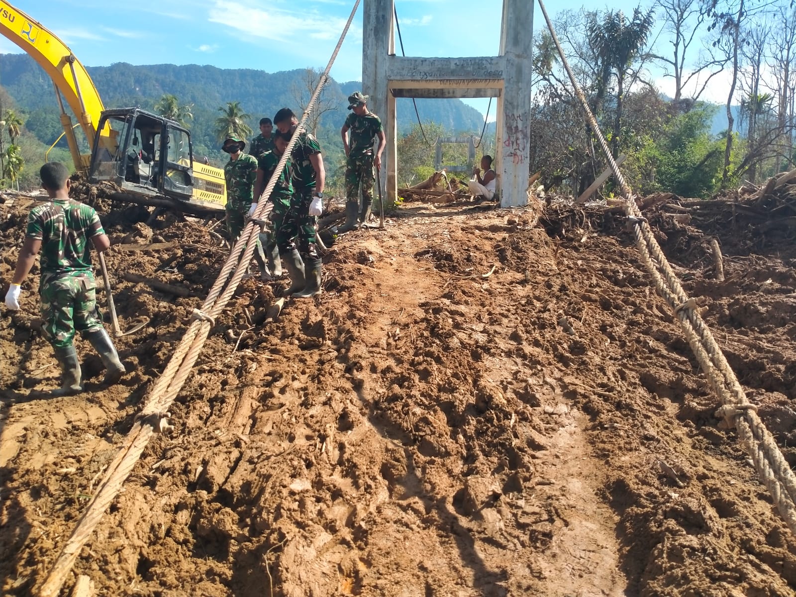 Kapendam I/Bukit Barisan Kolonel Inf Asrul Kurniawan Harahap, S.E., M.Tr.(Han), menyampaikan bahwa pembangunan Jembatan Gantung Perintis Garuda merupakan bagian dari komitmen TNI dalam membantu pemulihan infrastruktur masyarakat pascabencana.