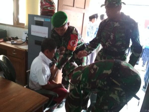 Dalam upacara tersebut kebetulan ada salah satu murid yang jatuh pingsan, Ragil (10) anak kelas 5 SD, serta merta Satgas Keslap menolongnya.