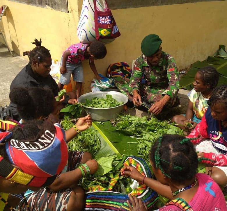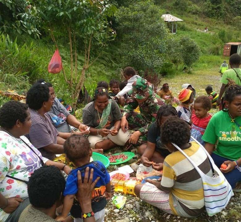Papua – Satgas Pamrahwan Yonif 754/ENK Kostrad dan Warga Opitawak gelar bakar batu bersama. Tujuan dilakukan kegiatan itu untuk menghilangkan rasa takut masyarakat Opitawak untuk beribadah dan beraktivitas seperti biasa.