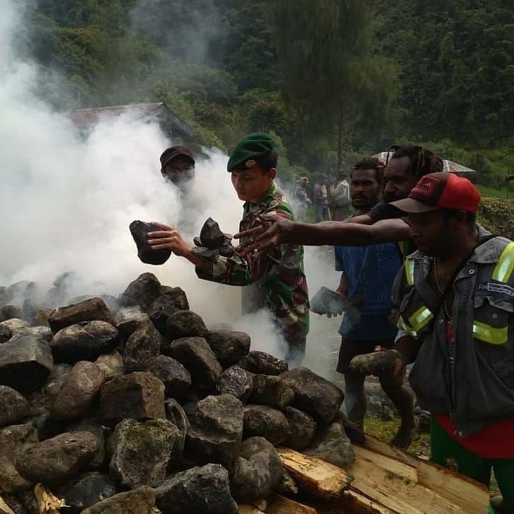 Diakhir kegiatan acara pembukaan kembali Gereja Kingmi masyarakat Opitawak dan anggota satgas pamrahwan Yonif 754/ENK Kostrad bersama sama melaksanakan kegiatan acara bakar batu.