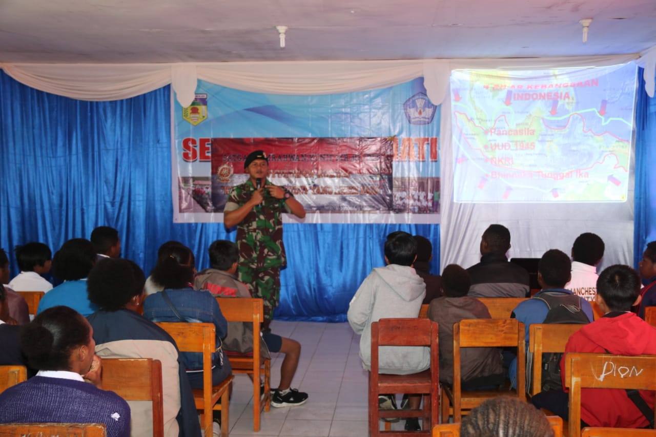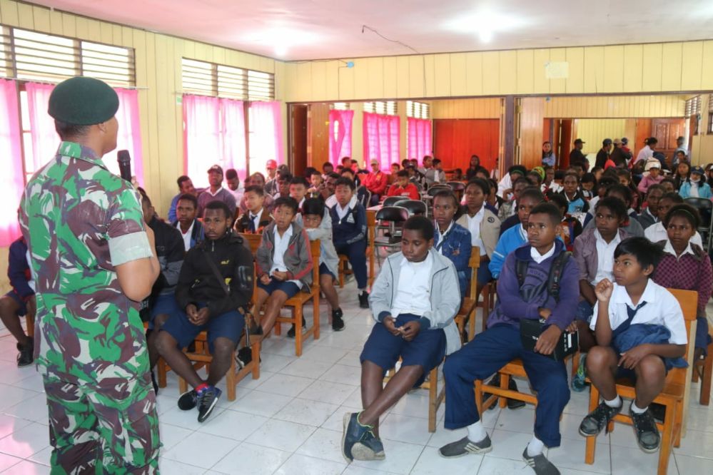 Puncak Jaya – Satgas Pamrahwan Kabupaten Puncak Jaya Yonif Mekanis Raider 412 Kostrad dalam rangka memperingati Hari Pendidikan Nasional 2019, Perwira Hukum Satgas Pamrahwan Yonif 412 Kostrad memberikan penyuluhan mengenai wawasan kebangsaan kepada siswa SMP N 1 Puncak Jaya. Jumat (03/05).