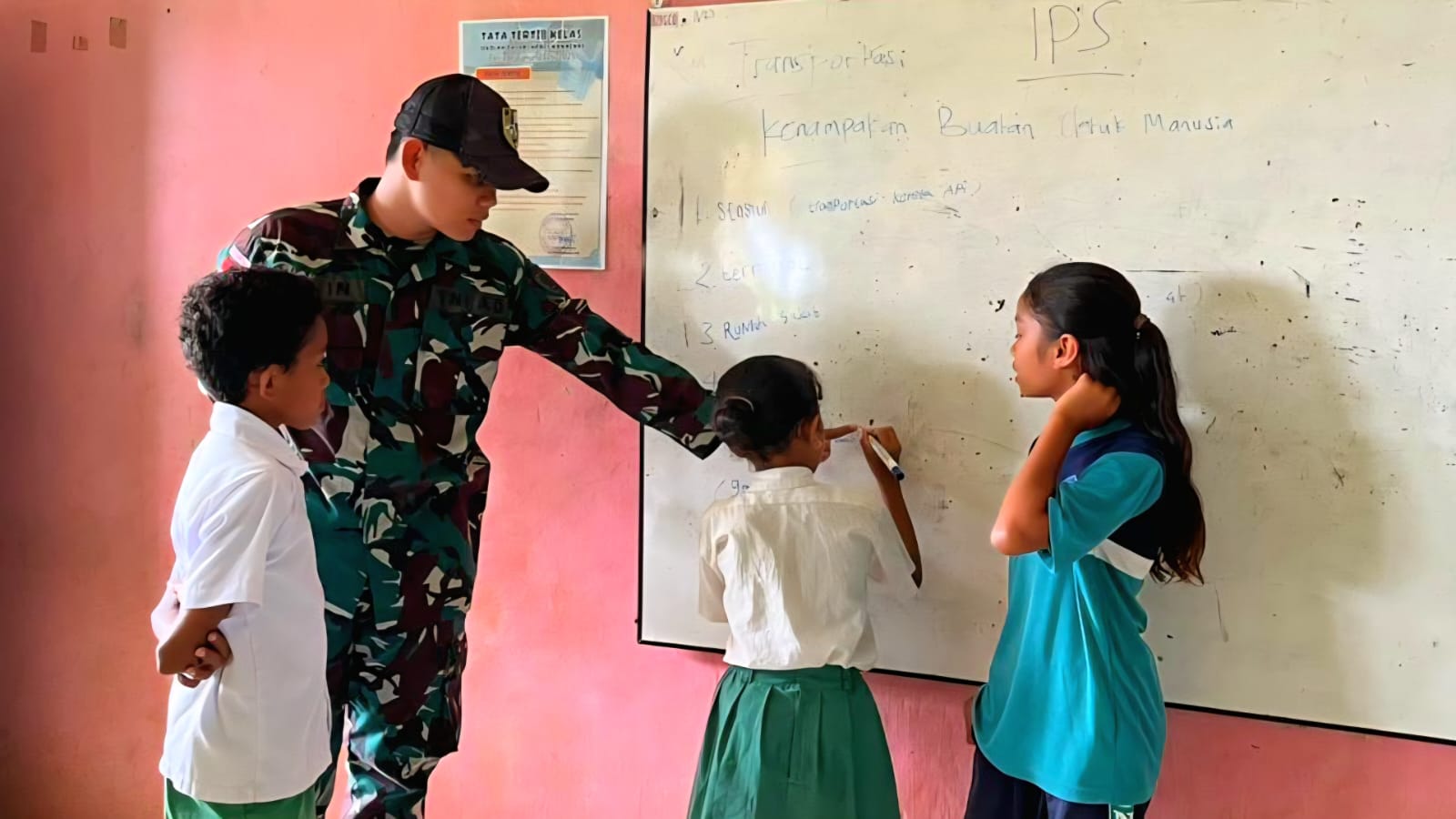 Belu – Satgas Pamtas RI–RDTL Sektor Timur Yonarmed 12 Kostrad melalui Pos Nananoe melaksanakan kegiatan pengajaran materi Ilmu Pengetahuan Sosial (IPS) kepada siswa-siswi SDI Nanaenoe, Desa Nananoe, Kecamatan Nanaet Duabesi, Kabupaten Belu, Nusa Tenggara Timur. Kegiatan ini merupakan bentuk kepedulian Satgas Pamtas terhadap pendidikan dasar di wilayah perbatasan. Jumat (19/12/2025).