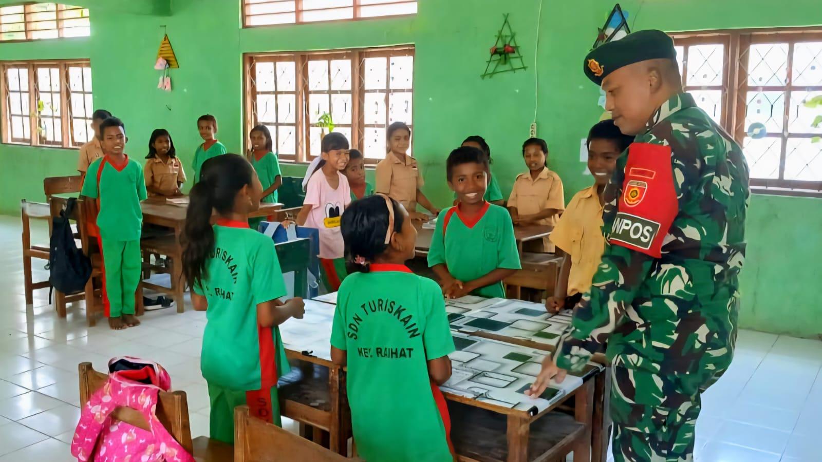 Belu, – Dalam upaya mencerdaskan generasi muda di wilayah perbatasan, personel Pos Turiskain Satgas Pamtas RI-RDTL Sektor Timur Yonarmed 12 Kostrad melaksanakan kegiatan pengajaran dan pendidikan di SDN 1 Turiskain, Desa Maumutin, Kecamatan Raihat, Kabupaten Belu. Kegiatan ini menjadi bentuk nyata kepedulian Satgas dalam membantu meningkatkan kualitas pendidikan anak-anak di daerah terpencil perbatasan.