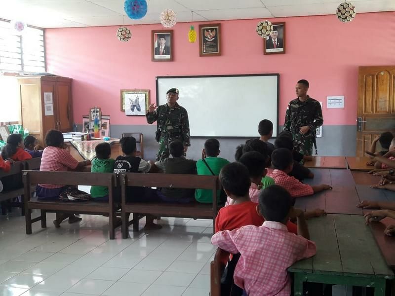 Keerom – Menumbuhkan wawasan kebangsaan kepada generasi penerus harus lah dimulai dari sejak dini, oleh karena itu Satgas Pamtas Yonif PR 328/DGH Pos Kout KM 31 dipimpin Letda Inf Eka Deny dan 6 personel lainnya tergerak untuk memberikan materi wawasan kebangsaan di SDN Arso 1, Kab. Keerom, Papua. Rabu (5/12).