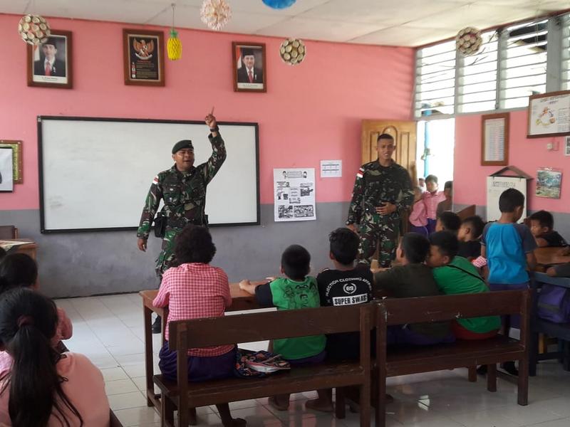 Keerom – Menumbuhkan wawasan kebangsaan kepada generasi penerus harus lah dimulai dari sejak dini, oleh karena itu Satgas Pamtas Yonif PR 328/DGH Pos Kout KM 31 dipimpin Letda Inf Eka Deny dan 6 personel lainnya tergerak untuk memberikan materi wawasan kebangsaan di SDN Arso 1, Kab. Keerom, Papua. Rabu (5/12).
