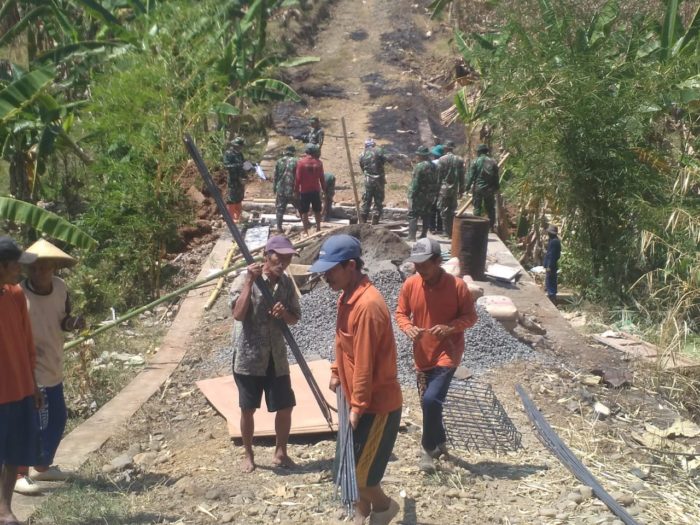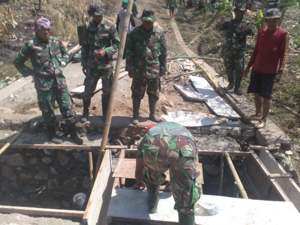 Batang – Anggota Koramil 01/Subah,Kodim 0736/Batang,dan warga dengan semangat berpacu melawan waktu,membuang rasa lelah,walau terik menyengat kulit tak dihiraukan tetap semangat melaksanakan pengecoran jembatan penghubung antara Dusun yang satu dengan Dusun yang lain di Desa Duren Ombo Kecamatan Subah Kabupaten Batang,jum’at (05/10/18).