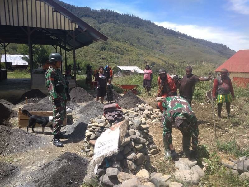 Puncak Jaya – Pos Nioga Satgas Pamrahwan Puncak Jaya Yonif Mekanis Raider 412 Kostrad, bersama warga Kampung Moai, Distrik Nioga, Kabupaten Puncak Jaya melaksanakan karya bakti berupa renovasi bangunan pasar yang rusak akibat konflik sosial pada pertengahan tahun 2018. Rabu (06/02/2019).