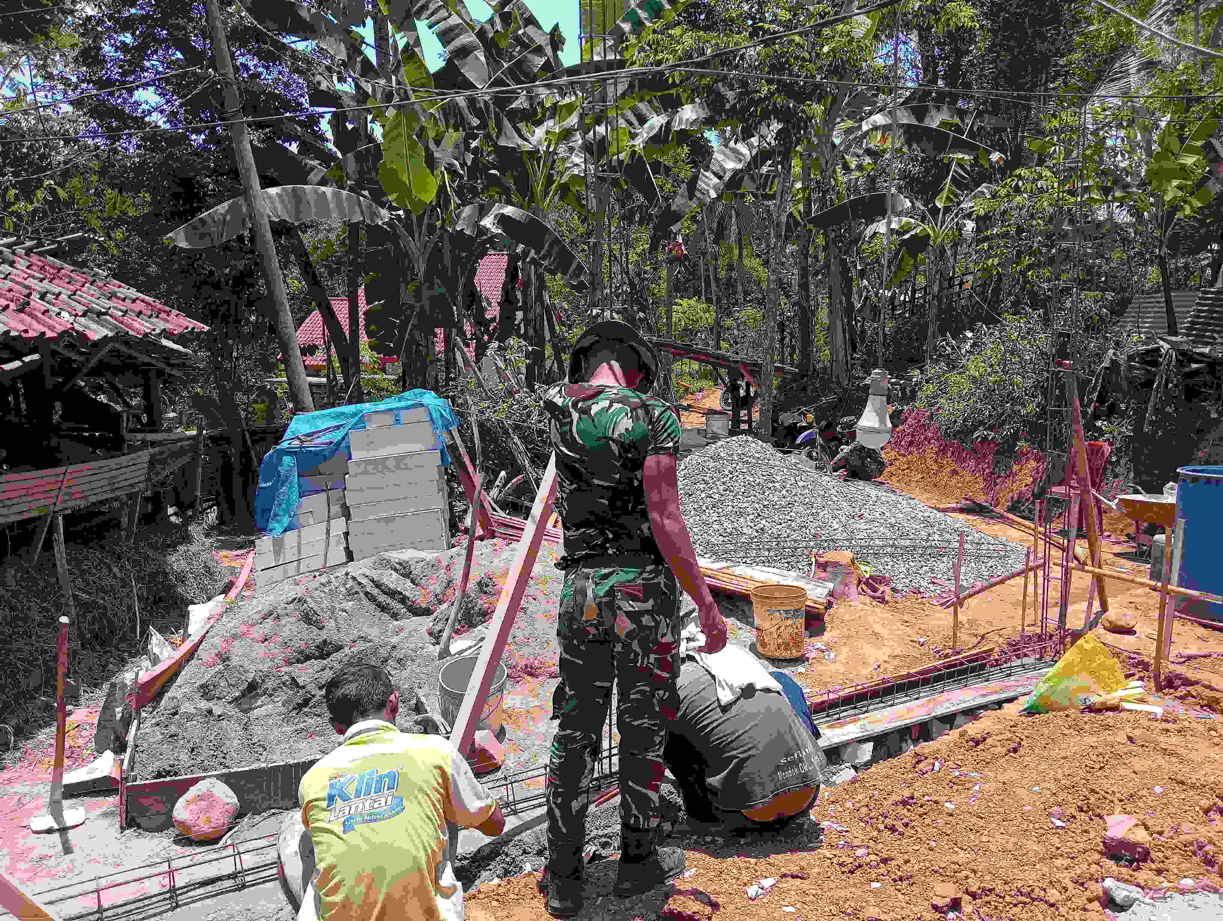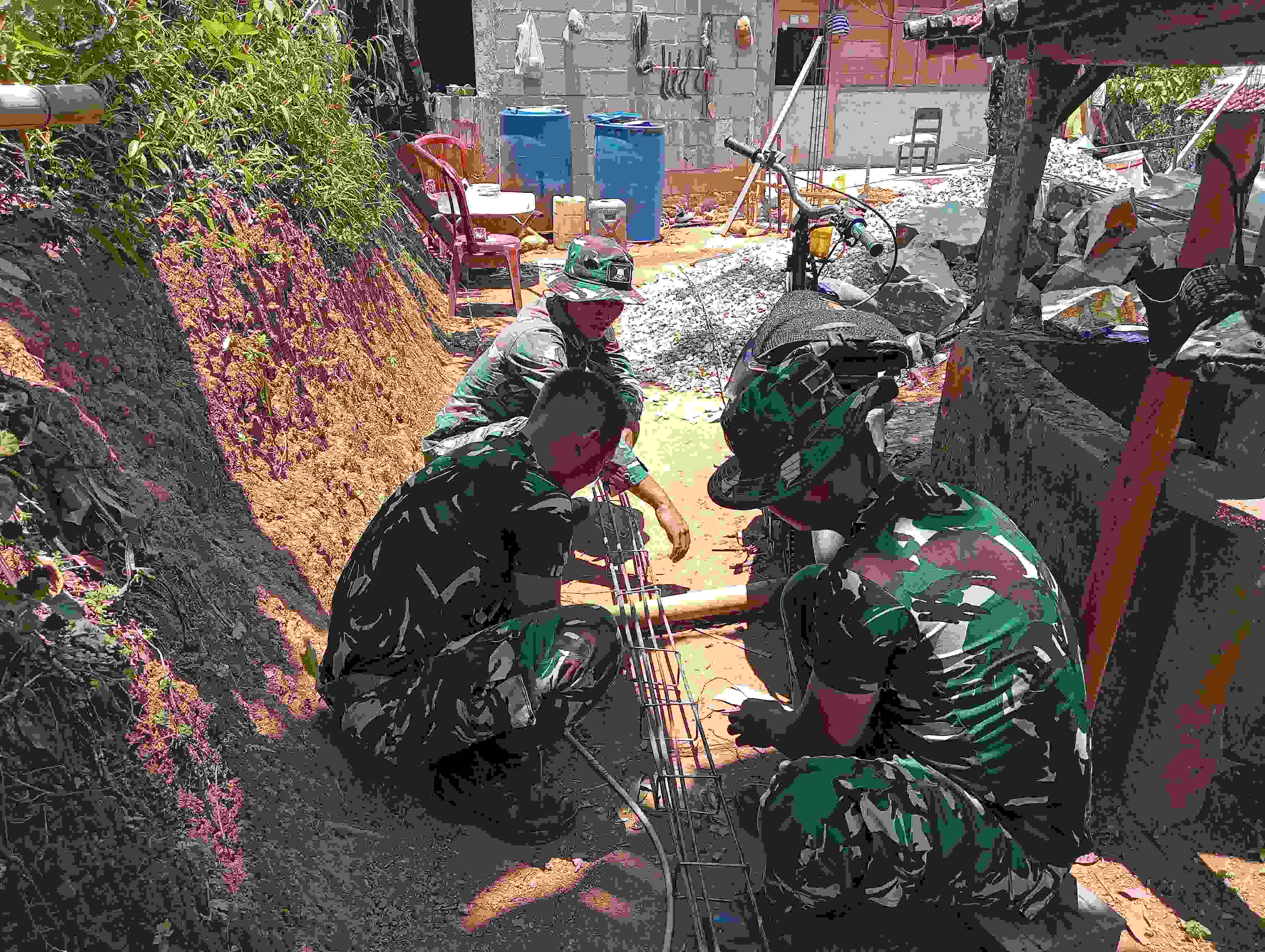Satgas TMMD dan warga membuat rangka tiang besi secara bergotong- royong. Dengan kerja yang dilakukan secara bersama-sama akan semakin ringan dalam melaksankannya sehingga tujuan untuk mempercepat pembangunan dan nantinya bisa segera di nikmati oleh Sumadi, warga tidak mampu yang mendapatkan program RTLH tersebut.