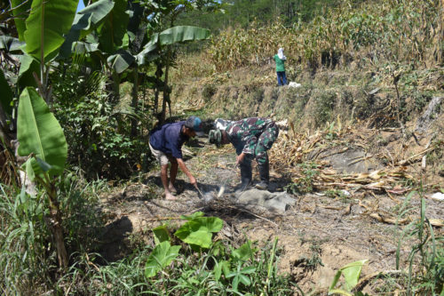Melihat ada warga yang memanen maizena/jagung, Peltu Siwiyono, anggota Satgas TMMD membantu Jarti (45) dan suaminya Karto (49) warga Dusun Kroya Rt/Rw. 3 Desa Pasegeran Kecamatan Pandanarum. Hal ini dilakukannya selain humanis kemasyarakatan juga mengharapkan jagung manis sebagai imbalan, guna mengisi tenaga daripada harus kembali ke rumah orang tua asuh yang jaraknya lumayan jauh.
