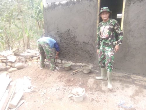 Batang – Satuan Tugas (Satgas) TNI Manunggal Membangun Desa (TMMD) Reguler ke 103 Kodim 0736/Batang dengan semangat,seperti yang terlihat di lokasi RTLH rumah Bapak Gemek Susanto (38) di RT 01/02 Desa Durenombo Kecamatan Subah Kabupaten Batang Sertu Mudiharso bersama anggota Satgas TMMD dan warga terus bahu membahu memasuki tahap pengerjaan plesterisasi dinding.