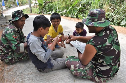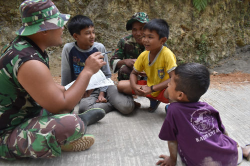 Banjarnegara – Tingkah dua orang Kopral Satgas TMMD Reguler 102 Banjarnegara ini dalam menumbuhkan dan memacu gairah belajar anak-anak Desa Pasegeran Kecamatan Pandanarum, adalah menggunakan media coklat sebagai stimulannya. Minggu (5/7/18).