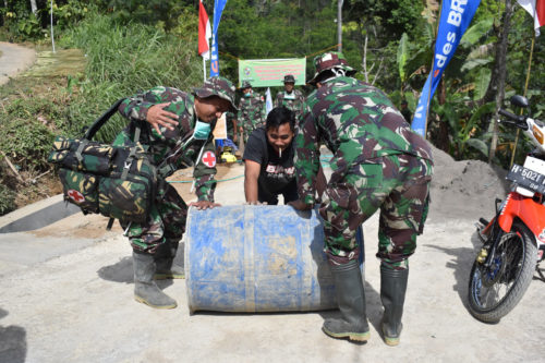 Terlihat Letda Inf Sumery, Danton SSK Satgas TMMD dan Sertu Indra, tenaga Kesehatan Lapangan (Keslap) Satgas TMMD dari Denkesyah 04.04.01 Purwokerto bersama Sumardi (39) salah satu warga Dusun Kroya Rt/Rw. 3 Desa Pasegeran, sedang mendorong drum plastik yang berisikan air menaiki tanjakan rabat beton di titik 300 meter untuk penyiraman dari atas.