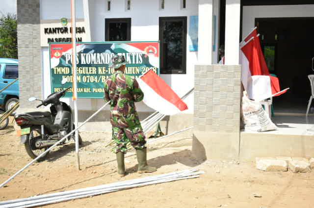 Tak terkecuali di Kantor Desa Pasegeran, puluhan bendera sedang dipersiapkan untuk dipasang untuk menyambut hari kemerdekaan bangsa Indonesia. Terlihat Serda Sumaryono, anggota Satgas TMMD Koramil 14 Madukara Kodim 0704 Banjarnegara sedang mempersiapkannya.