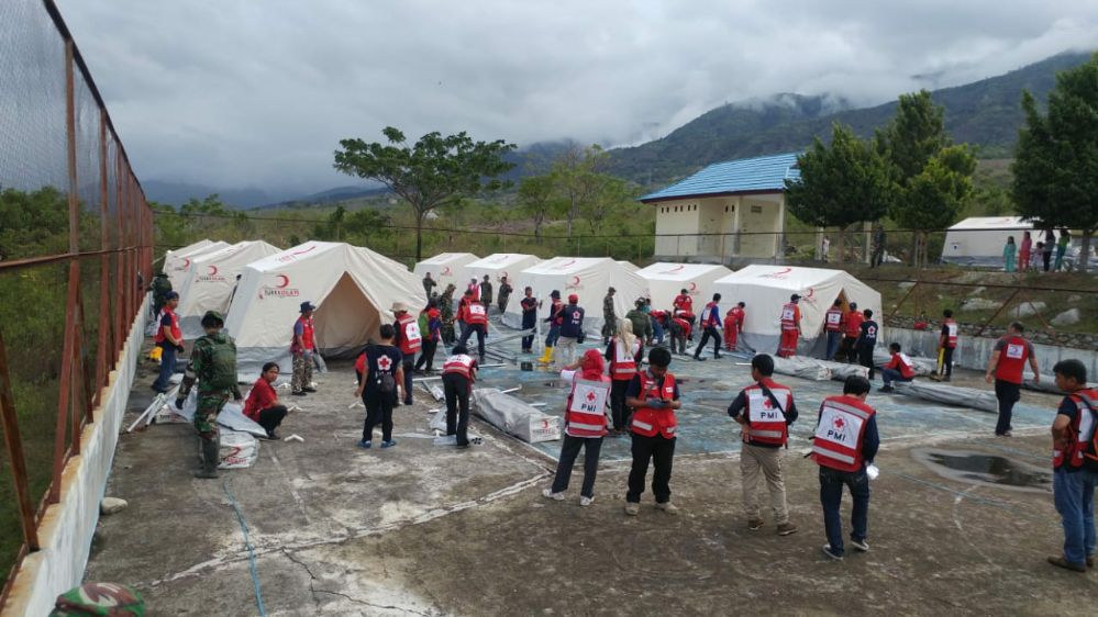Palu Barat – Satgas Gulbecal YPR 432 Kostrad dipimpin Mayor Inf Gustiawan F bersama Palang Merah Indonesia (PMI) mendirikan 150 tenda pengungsi bantuan dari Turki di Kel. Balaroa Kec Palu Barat. Palu. Minggu (14/10/2018).