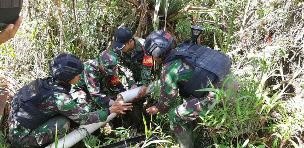Akses jalan menuju ke sumber air yang sulit bukanlah halangan bagi personel Satgas Pamtas RI-PNG Yonif Raider 514 Kostrad. Dengan semangat membantu masyarakat, para prajurit tiba di sumber air yang akan diperbaiki, selama 3 jam sumber air selesai diperbaiki bersama.
