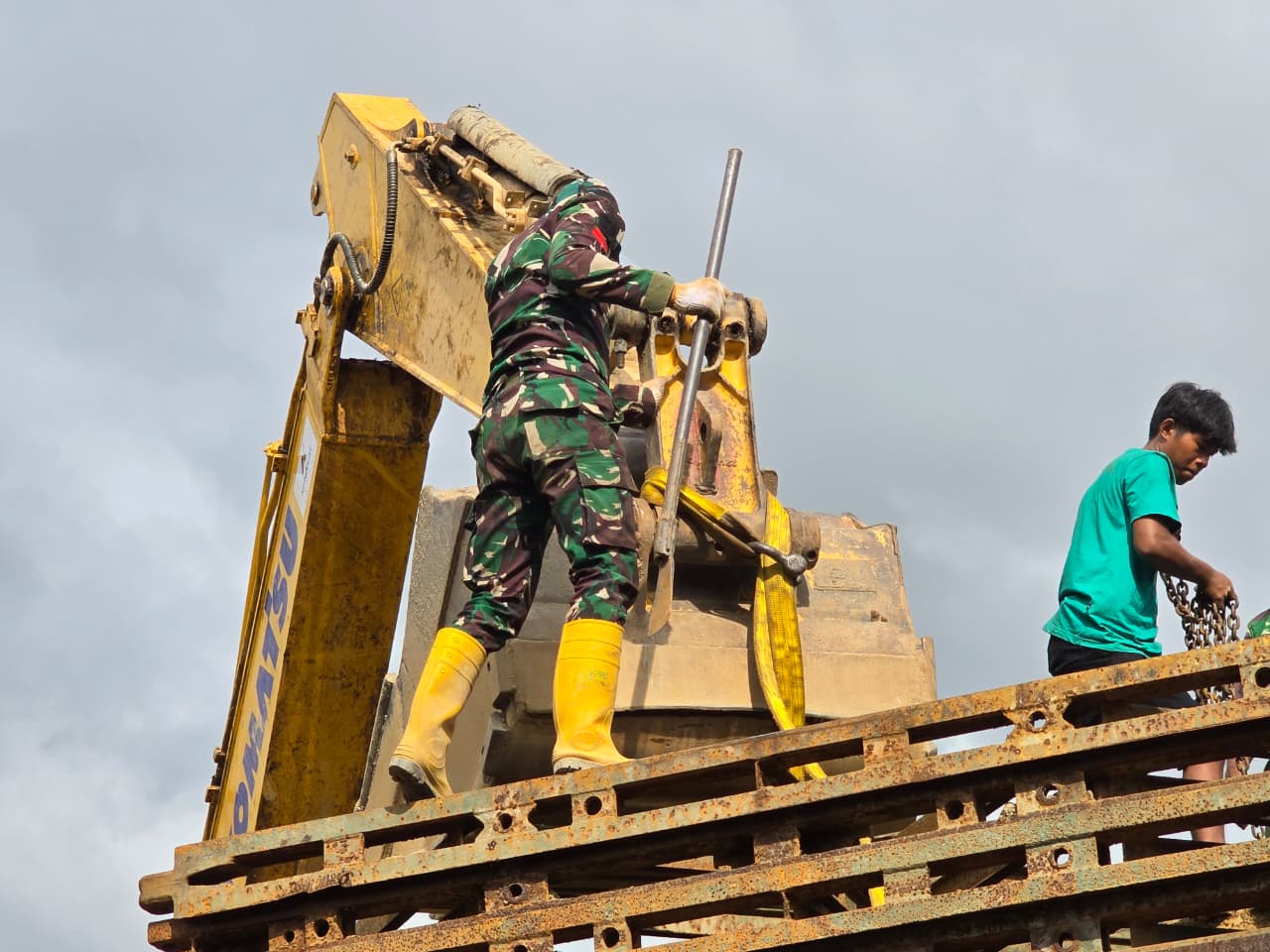Upaya pemulihan dilakukan dengan mengerahkan personel Yonzipur I/DD serta dukungan alat berat berupa crane dan excavator untuk menata komponen jembatan darurat di lokasi. Pemasangan dikebut mengingat jalur tersebut menjadi akses vital bagi warga dua kabupaten.