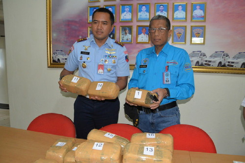 “Anggota kami langsung mendekati kotak berwarna coklat tersebut kemudian dilihat ke dalam kotak yang sudah terbuka itu, ada paket-paket didalamnya yang terbungkus menggunakan lakban berwarna coklat dan dicurigai merupakan paket ganja kering”, ujarnya. “Paket tersebut, lanjut Dansatpom Lanud Atang Sendjaja, kemudian dibawa ke kantor Satpom dan dicek, ada 17 paket yang dicurigai adalah paket ganja.