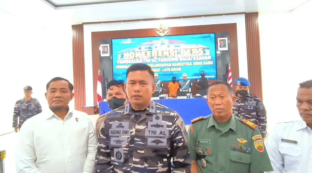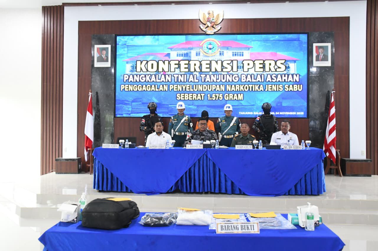 Tanjung Balai, 24 November 2025 – – – Tim gabungan TNI AL beserta Tim Fleet Quick Response Lanal Tanjung Balai Asahan kembali menunjukkan komitmennya dalam memberantas kejahatan narkotika di wilayah perairan Indonesia dengan menggelar konferensi pers tentang penggagalan upaya penyelundupan narkoba jenis sabu seberat 1.575 gram yang dipimpin oleh Komandan Lanal Tanjung Balai Asahan Letkol Laut (P) Agung Dwi H.D., M.Tr.Opsla., CTMP. di Mako Lanal Tanjung Balai Asahan, Senin (24/11).