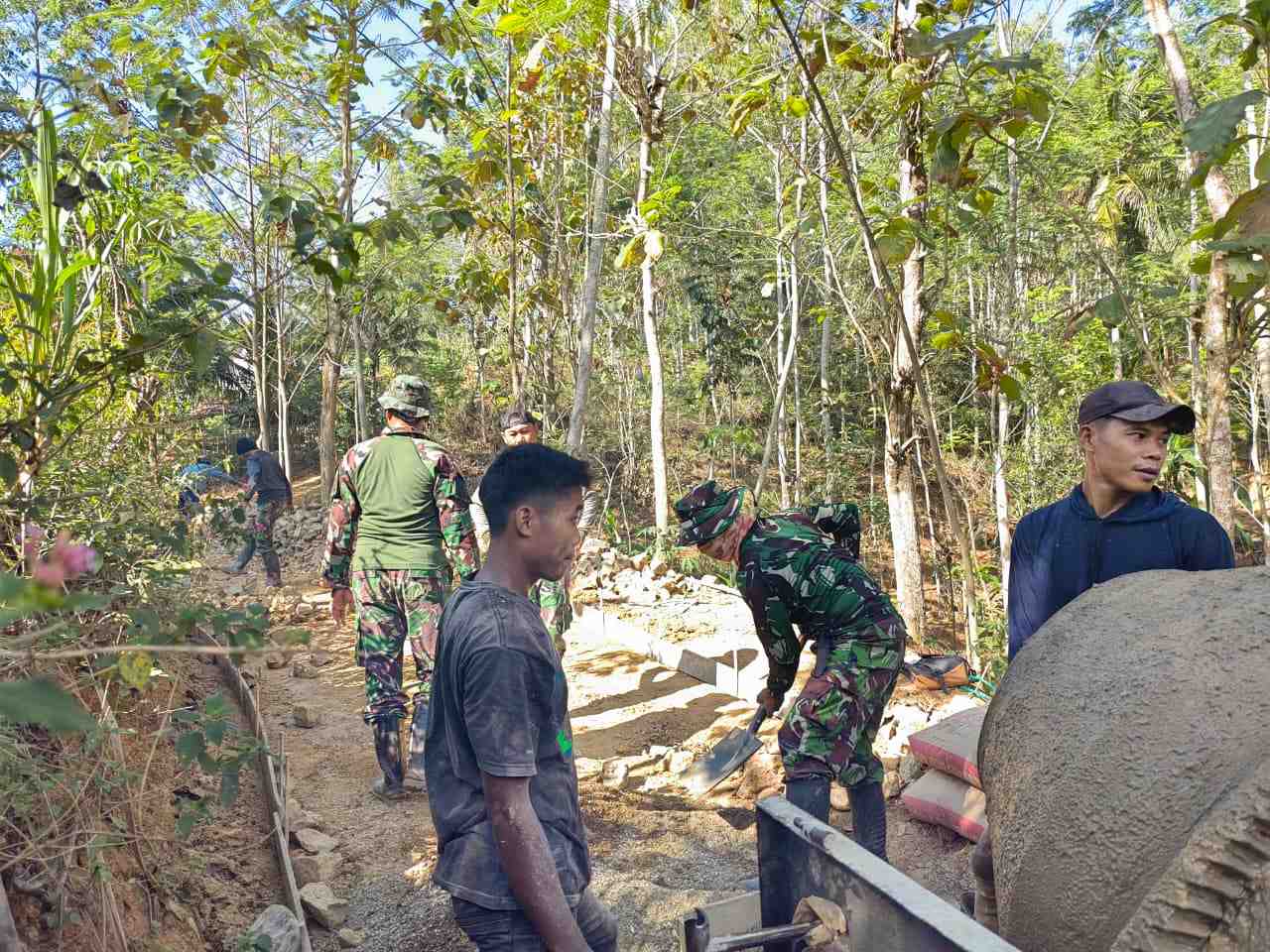 Pacitan, – Pengerjaan Sasaran fisik Program TNI Manunggal Membangun Desa (TMMD) Reguler ke-126 Kodim 0801/Pacitan di Desa Petungsinarang, Kecamatan Bandar, Kabupaten Pacitan terus dikerjakan bersama masyarakat seperti pembangunan jalan rabat beton.